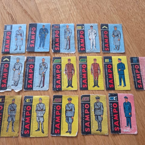 Myynnissä kuvan mukaiset Sampo sotilaat tulitikkuetiketit joita on 51kpl