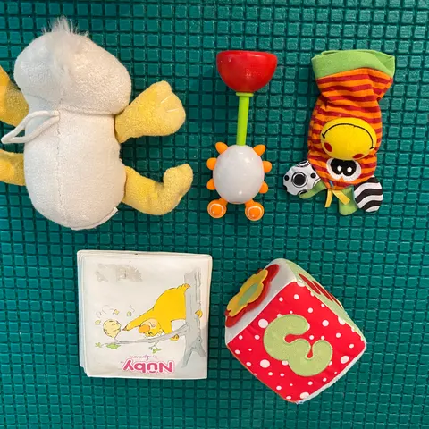 Koiran lelut mutta ostettu vauvalle. Iso vinkuu kun painaa. Loput sisältää joku prasseli ääni. Hyvässä kunnossa!