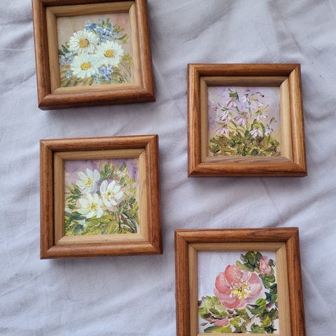 Taulut kumpikin ovat 25 x 20, puukehykset ja lasi. Sopivat nätisti esim nuoren ensiasunon sisustukseen tai kph/toilette-huoneeseen silmäniloksi yms.