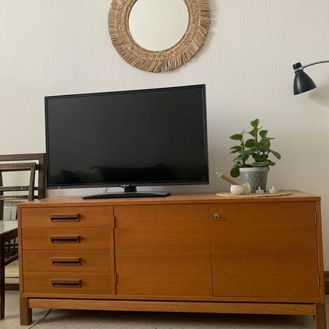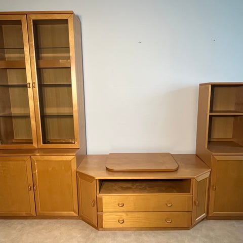 Ikean Markör-sarjan antiikkipetsatut puiset kalusteet, tv-taso, kirjahylly & vitriinikaappi.