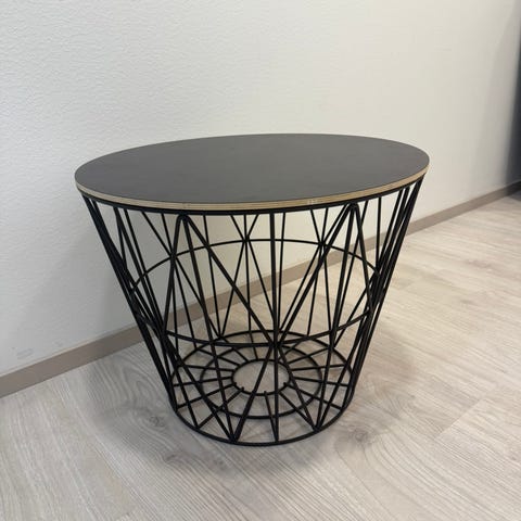 Ferm Livingin Wire Basket ja puinen kansi. Voidaan käyttää säilytyskorina ja/tai pöytänä. Korin ja kannen väri musta. Lähinnä hienoista käyttökulumaa, kokonaisuudessaan varsin siistikuntoinen.