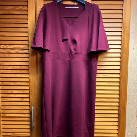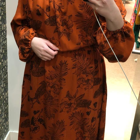 Mekossa on todella hyvä leikkaus ja se istuu hyvin. Väljyyttä jää jonkin verran. Kangas on puuvillaa, joten ei veny. Mekossa on taskut.