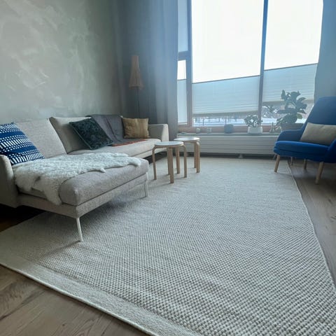 Villamatto on käytön jälkeen käytetty pesulassa. Pesulan pussi on kuitenkin säilytyksessä rikkoutunut, joten matto on todennäköisesti hieman pölyinen. Kuosi on kaunis ja värikäs muistuttaen hieman räsymattoa. Matto on ollut meillä mökillä sekä lasten huoneessa, mutta ei oikein löydä paikkaansa.