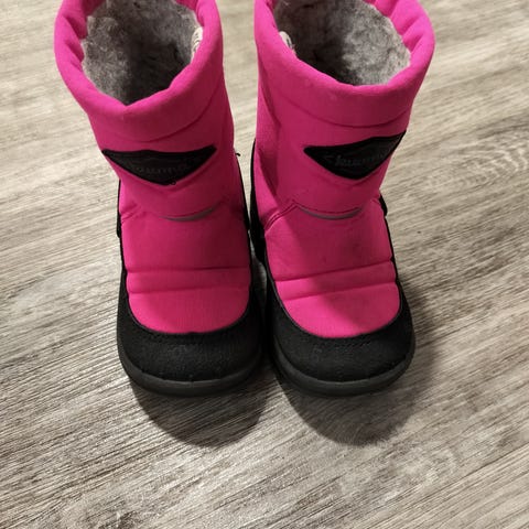 Kuoma lasten talvikengät tytöille, koko 21. Väri pinkki kuviollinen, musta vahvistettu kärki ja pohja. Kengissä on lämmin vuori ja tarrakiinnitys varressa. Soveltuvat kylmään säähän ja ulkoleikkeihin.