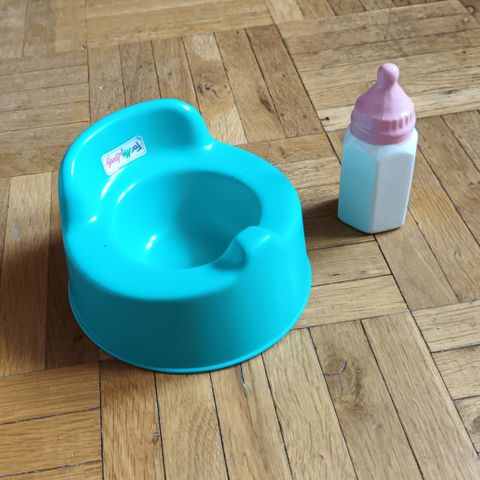 Kuvassa näkyvät nuken astiat. 2x tuttipullo, nokkamuki, silmätipat, 2xlautanen, 1 lusikka, 2x haarukka.