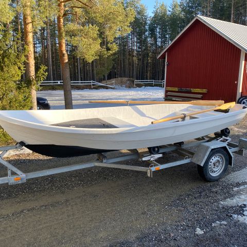 Heittokalastukseen rakennettu vene. Rakennettu 2x2 painekyllästetystä ja 15mm filmivanerista johon liimattu autoihin tarkoitettua lattiamattoa päälle. Ulkopuoli vähän rujossa kunnossa mutta pitää veden ulkopuolella.