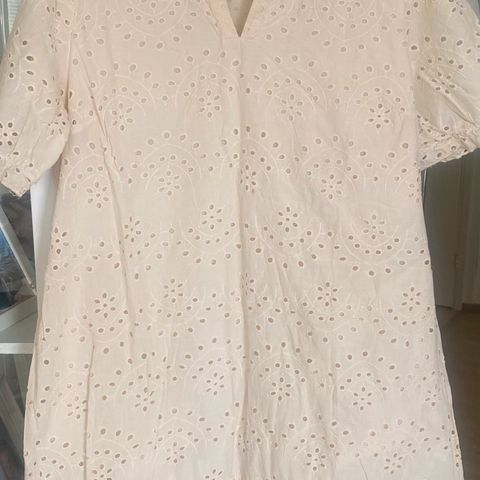 ¾-hihat (kyynärpään alapuolelle ulottuvat), kellotettu hihansuu, pyöreä pääntie ja nappikiinnitys takana. Sopii juhlaan ja arkeen.