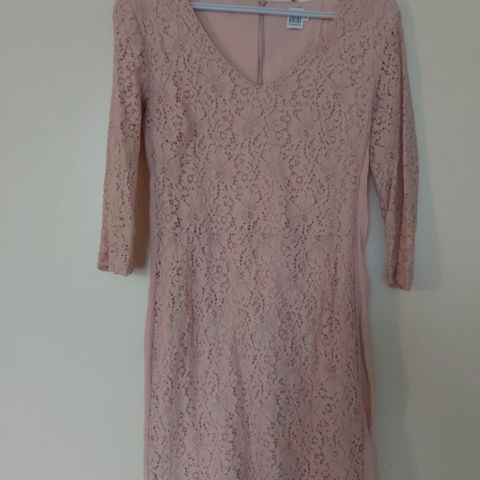Kaunis ja ajaton pitsimekko, jossa vaaleanpunainen vuorikangas.