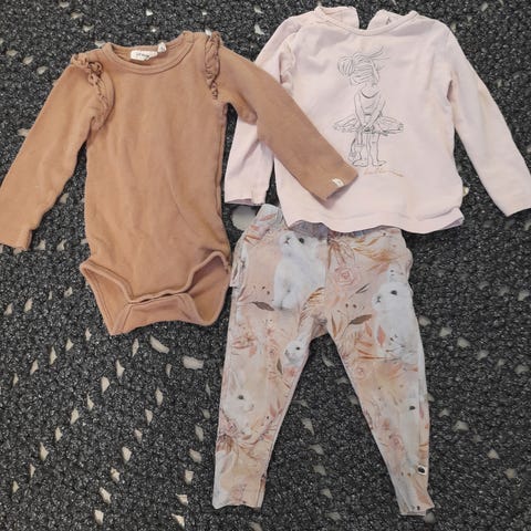 Vaatepaketti tytölle koko 74-80cm. Neljät housut (newbie frillahousuissa tummentumaa polvissa), Newbie hupullinen haalari (koko 80cm, vähän tummentumaa polvissa), kolme bodya (nosh ja lil'atelier), kolme mekkoa, kaksi kesähattua ja 8 paria sukkia (kappahl/newbie koko 16-19). Pesty hajusteettommasti.