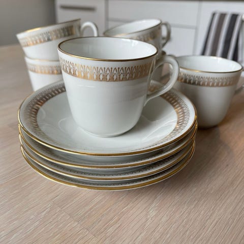 Kolme kuppiparia (kuppi ja aluslautanen) ja kaksi ylimääräistä aluslautasta. Kaikki yhteensä 8 euroa.