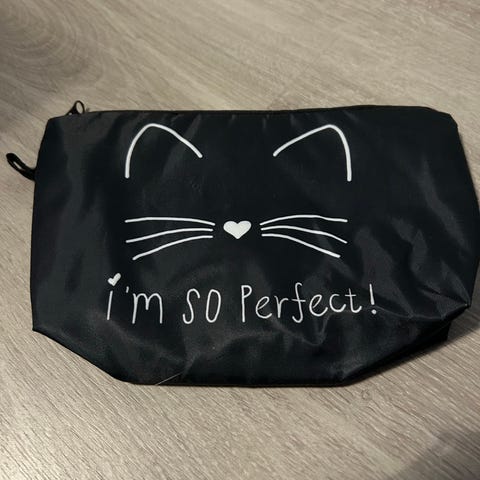 Meikkipussi. Leveys 17 cm, pituus 20, korkeus 7 cm. Kuva 2 sisältä. Lokerikko esim. pensseleille, tasku kannessa. Käytetty, mutta siisti.