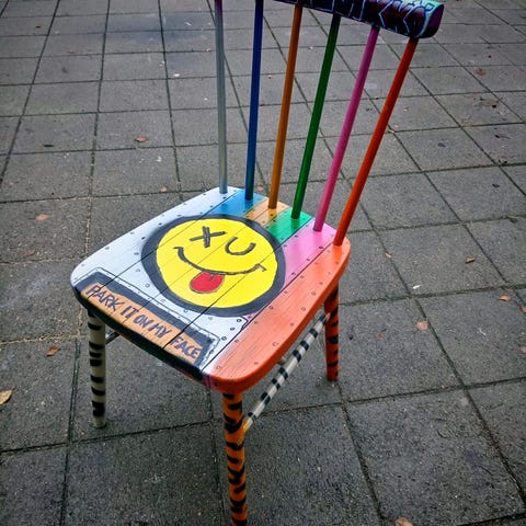 Perinteinen koululaisen tuoli. Meillä ollut käytössä yöpöytänä ja kukkapyötänä. Tuotu Saksasta, hyvin tukeva.