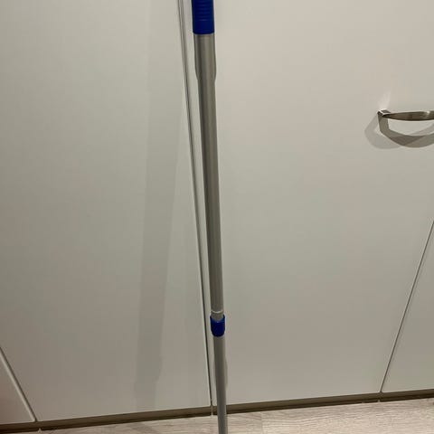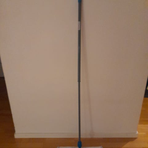 Sini-merkkinen lattiapesin mikrokuituliinalle. Varren pituus 150 cm. Leveys n. 37 cm.