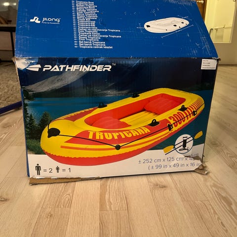 Tosi hyvässä kunnossa oleva kumivene. Käytetty pari kertaa, ei reikiä. Pumppu ja airot mukaan. Veneen mitat ovat 246 x 122 cm.