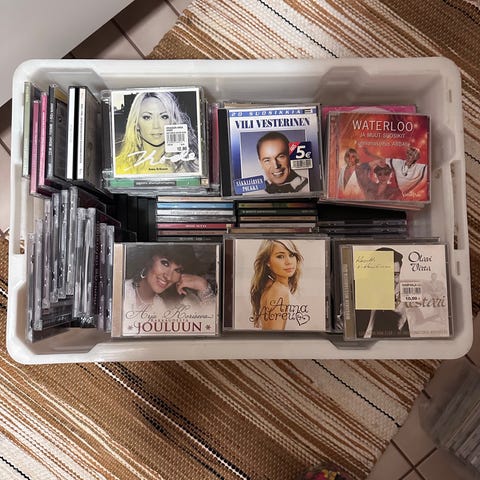 127 kpl CD-levyjä, todella vähän kuunneltuja, eli pitäisi olla priimakunnossa (meillä ei juurikaan musiikkia kuunnella, nämä ovat lähinnä laatikossa lojuneet). Joukossa poppia, rockia, jazzia, klassista, gospelia ja lastenlauluja.