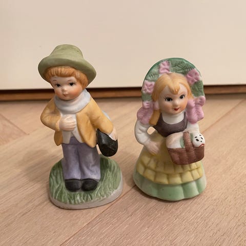 Kaksi posliini tuikkua, val.sin. ja kuviollinen.