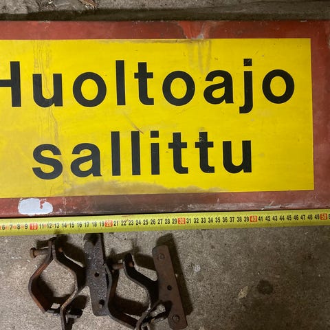 Hieno paketti sisääntuloon. Kyltti puuta. Runko terästä. Korkeus 246. Kiinnitystangon leveys 122cm.