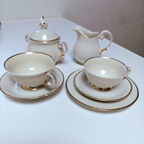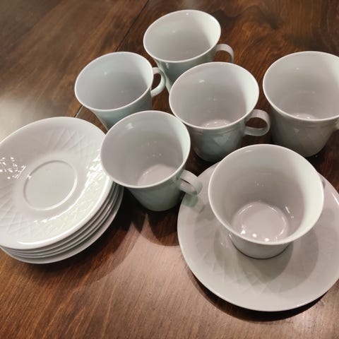 6-hengen Arabian "Japani" sarjan kahvi/teeastiasto. Virheetön ja aivan uuden veroinen. Sisältää myös kermakon ja sokeriastian. Tuotannossa vuosina 1948-1992. Malli on Svea Granlundin.