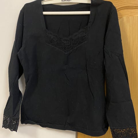 Bershka S naisten paita, musta pohjaväri valkoisilla pilkuilla. Pitkähihainen paita, jossa valkoinen kaulus. Materiaalia ei ole ilmoitettu. Sopii naisille, koko S.