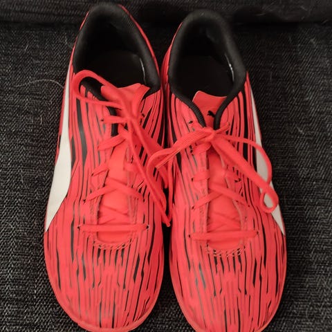 Kelta-mustat Puman futsalkengät ilman nauhoja. Koko 32.