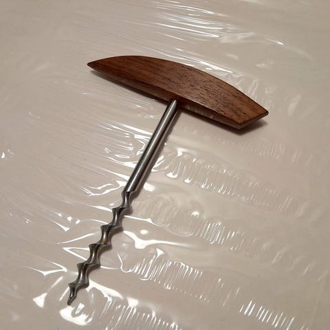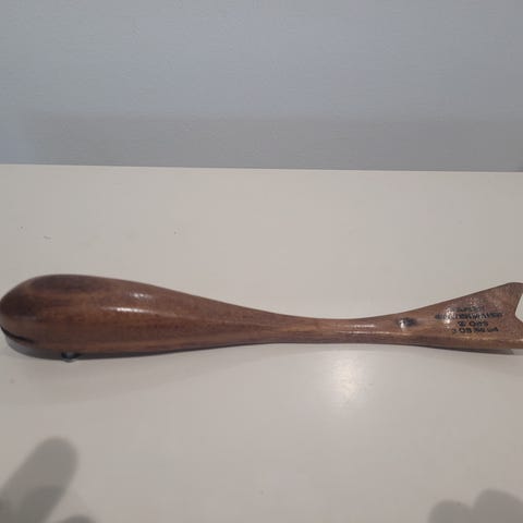 Teak-puuta oleva kruunukorkin pullonavaaja. Hieman vääntynyt joka näkyy kuvassa mutta ei haittaa käyttöä