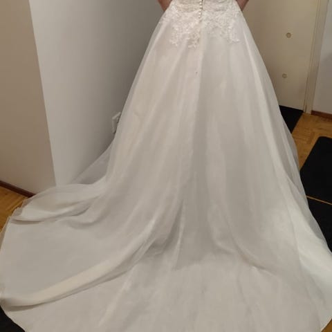 Puku on yleisesti ottaen siisti, mutta kaipaa vähän elvytystä. Kuvissa näkyy pienet kauneusvirheet. Vieläkö joku tekisi tästä itselleen hääpuvun? 😊