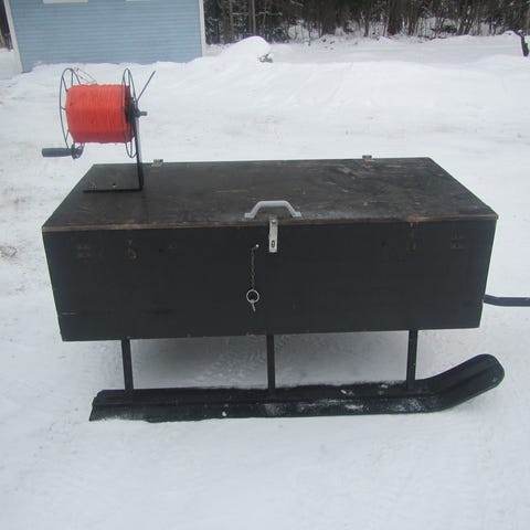 Pihan tyhjennystä moottorikelkalla vedettävä pulkka.Suksien Lev. Ulkoreunasta ulkoreunaan 125cm,Pulkka pit.186 cm lev.60 cm,aisa pulkasta 40cm
