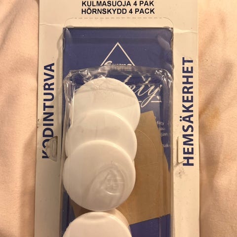 Myytävänä on Canpol Babies-merkin kulmasuojussetti. Näillä pehmeästä muovista valmistetuilla kulmasuojuksilla suojaa pöytien ja tasojen kulmat törmäyksiltä liikkumaan oppivan vauvan/taaperon kanssa. Setissä oli 4 kpl joista 1 otettiin käyttöön, loput 3 jäivät ylimääräisiksi. Hyvin toimivat, mukana tulee ohjeet sekä teipit. Designissa hauska hymynaama ja toisella puolella kissa!