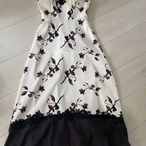Mekko on puhdas, mutta sitä ei ole pesetetty. Pieni hakanen vetskarin yläpuolella on irti, mutta ommellaan paikoilleen (kuvassa). Käytetty noin kolme kertaa. Magic Nights -merkki.