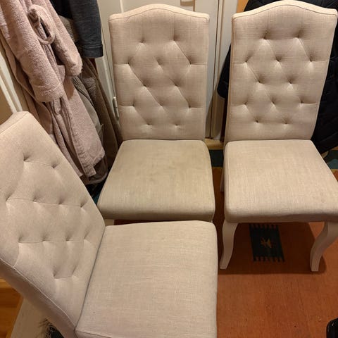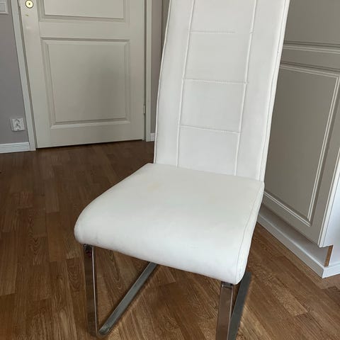 Myydään neljä valkoista, keinonahkaista ruokapöydän tuolia. Käytön jälkiä kaikissa. Yhden tuolin istuinosan pinnassa viiltoja (kts kuva). Hinta yhteensä 40€, myydään kaikki neljä kerralla. Vain nouto.
