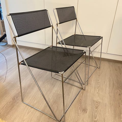 Tyylikkäät metalliset tuolit hyvässä kunnossa. Pieniä käytön jälkiä saattaa näkyä pinnassa. 4kpl yhteensä ja myyn settinä. Vintage malli, X Line tuolit Niels Jorgen Haugesenilta.