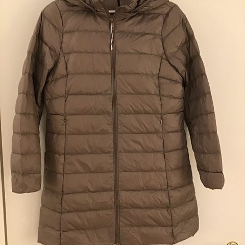 Tyköistuva, kevyt ja ohut untuvatakki jossa niukempi mitoitus. 2 suuntaan avautuva vetoketju. Vetoketju ylös huppuun asti. Hyvät muotoleikkaukset, istuu kauniisti päällä. Koko L, niukka mitoitus. Kainalo-kainalo mitta 53cm, olka-helma 78cm, vyötäröleveys 49cm.
