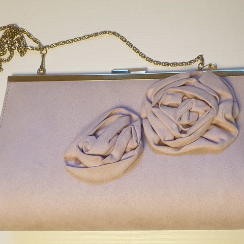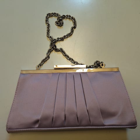 Kerran käytetty uudenveroisessa kunnossa oleva hempeän vaaleanpunainen satiininen iltalaukku. Nepparikiinnitys. Leveys n. 22 cm.