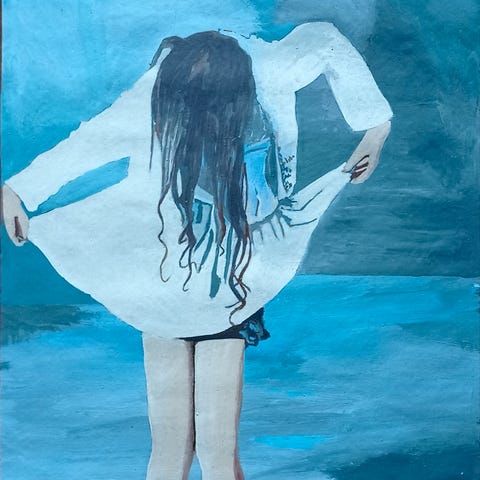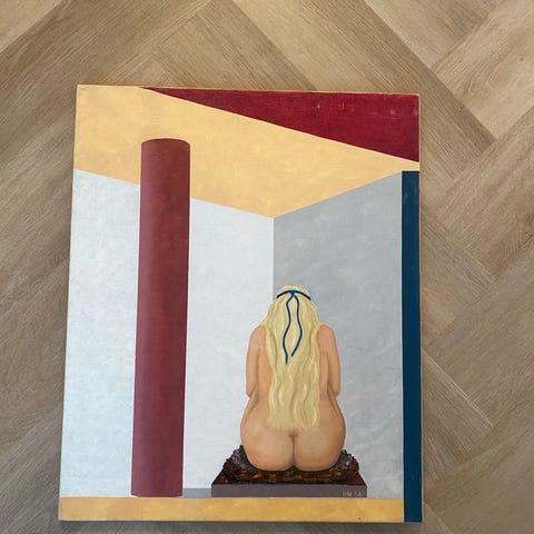 Taulu esittää naishahmoa sinisessä mekossa abstraktilla taustalla. Maalaus on tehty akryyliväreillä kankaalle. Värit ovat pastellisia ja taustassa on vaaleita sävyjä. Taitelija Linda Cederberg. Tilaustyö.