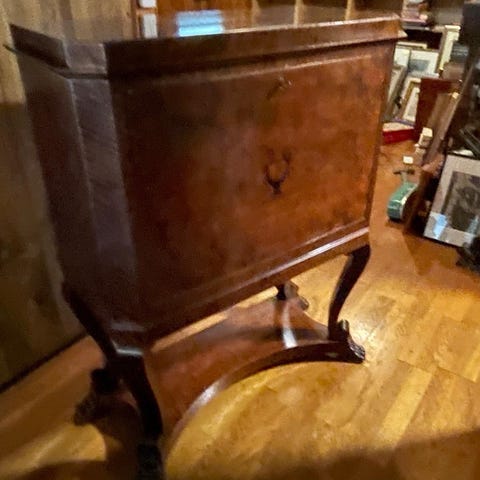 Vanha, antiikkinen nuottihylly, 1900-luvun alusta. Puuta ja messinkiä, pyörät jalkojen alla. K 83, l 43, s 29.