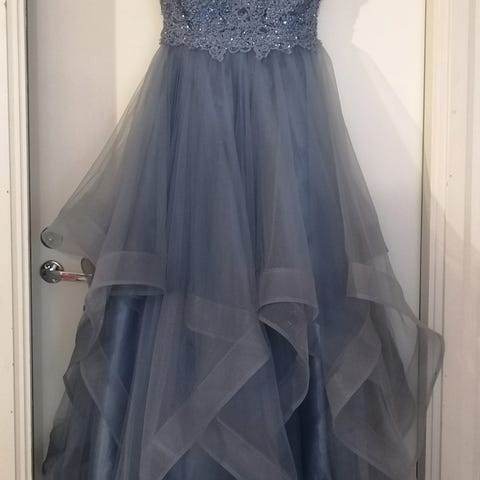 Yhdet tanssit tanssittu vanhojentanssi mekko koko L ja vannehame L ja pukupussi. Tummansininen jossa glitteriä, kuin ilotulitusta. Takana nyöritys. Helmassa pieni laahus. Pari kerrosta tylliä ja alushame. Hieman lyhennetty, tanssija n 172cm ja tanssi lenkkarit jalassa. Eläintalous, pukupussissa pidetty. Järvenpää, Nummenkylä, vain nouto. Saa tulla sovittamaan.