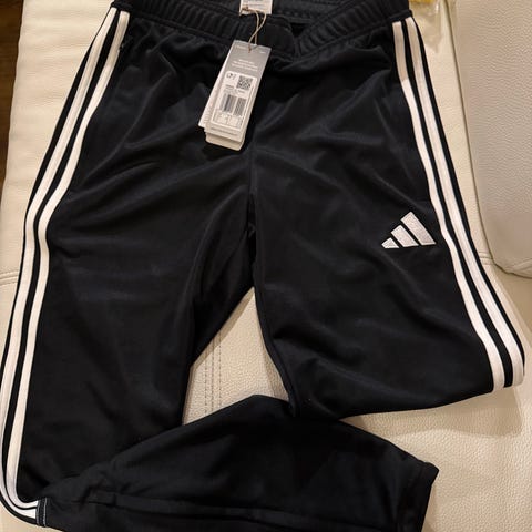Uudet ADIDAS Tiro 21 TR PNT slim fit urheiluhousut jalkapalloon koossa XS, vastaa kokoa 164 cm. Housut mustat ja niissä muodikkas Adidaksen 3-riviraidoitus. Joustovyötärö, jossa kiristysmahdollisuus nauhoilla. Housuissa kaksi vetoketjullista etutaskua sekä kapenevat lahkeet. Lahkeissa vetoketjut.