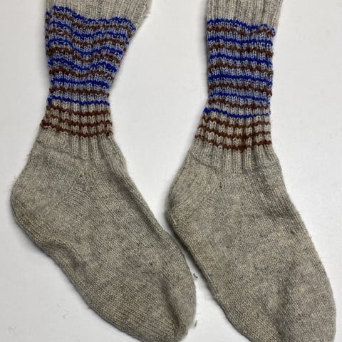 Hyvässä kunnossa olevat villasukat, harmaat joissa keltaisia raitoja.