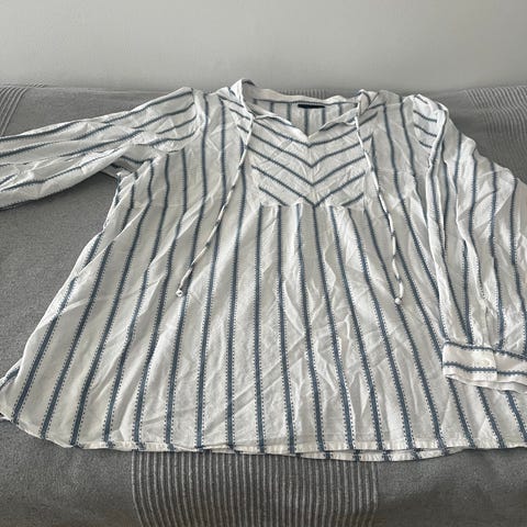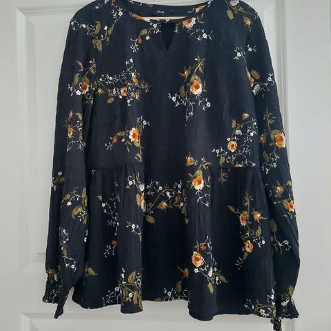 Zizzin viime talven malliston keinokuituinen kukallinen suoravartaloinen ribbineulospaita. Kangas on hieman kiiltäväpintaista ja ribit suht leveitä. Hihansuissa on kuminauha ja olkapäillä vähän puhvirypytystä. Käytin päivän ja totesin itselleni isoksi, sillä olen Zizzin S-kokoa ja paidan mitat vastaavat minusta enemmän Zizzin M-kokoa.