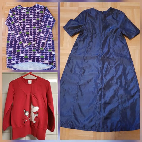 Myynnissä lastenvaatteita koossa 98-116 sekä naisten vaatteita koossa M-L, asusteita ja lasten kenkiä.