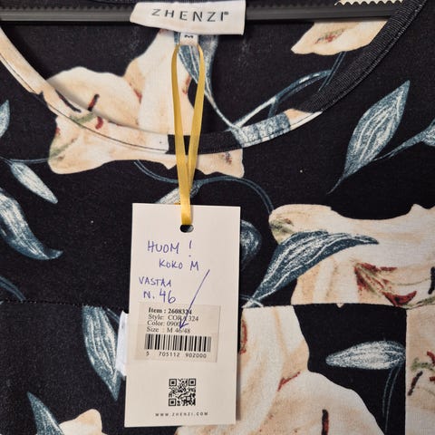 Kaunis ruskea kukkakuosi. Zhenzin koko S vastaa 42-44 kokoa. Uudenveroinen. Väri luonnossa vielä kauniimpi. Musta vuorikangas, läpikuultavat hiat.