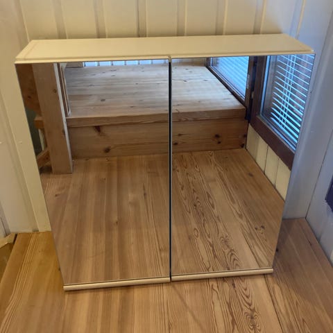 Peilikaapissa on käytön jälkiä ja toisen peilioven vasemmassa yläkulmassa on halkeama (lisäkuva).