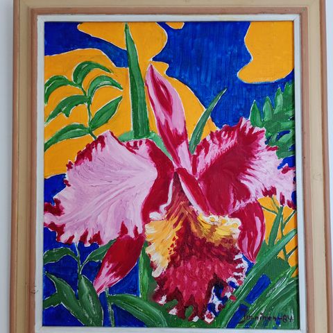 Leveys 57.5cm ja korkeus 48cm. Päällä on lasi. Kehyksissä kulumaa. Taulun ikää en osaa arvioida, Saimi maalasi 1930-1980 luvulla.
