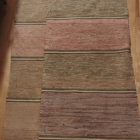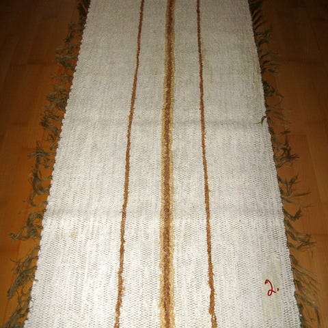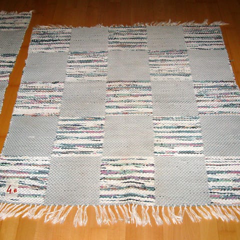 Isompi sini valko raitainen räsymatto. Joku kahvi tahra saattaa löytyä.
