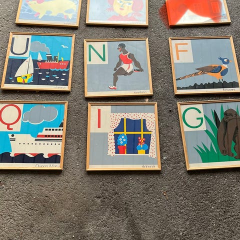 Kansakoulun aakkostauluja 20e/kpl. Kuvat vanhoja, joten pientä kulumaa näkyy mm. kuvien reunoissa. Koko 35x50.