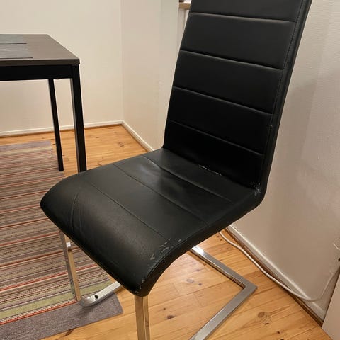 Hyväkuntoinen ruokatuoli mustalla nahalla. Toiminut mallina hyllyssä eli todella hyvässä kunnossa.