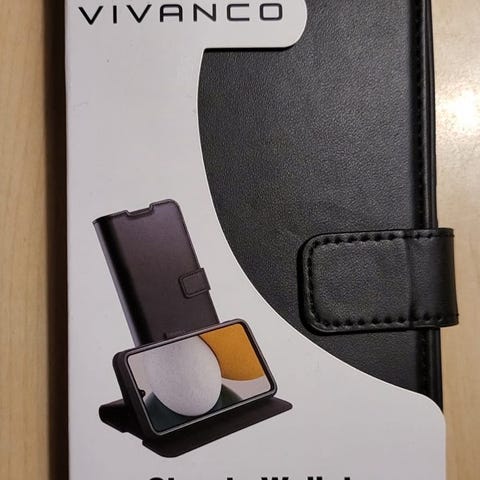 Hyväkuntoinen lompakkokotelo Samsung Galaxy A34 5G -puhelimelle. Pientä kulumaa sisäpuolella taitoskohdissa.