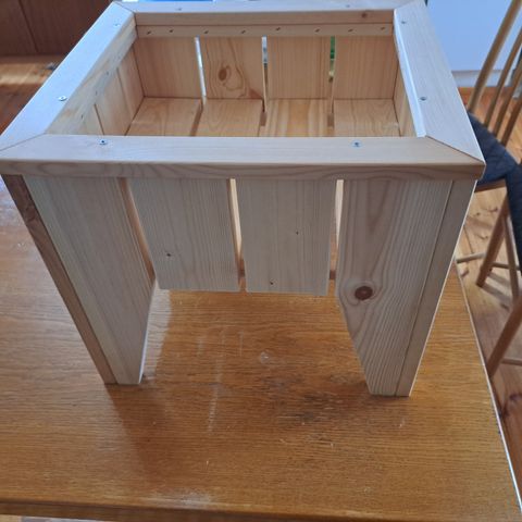 16mm vanerista tehty tukeva laatikko. Sisältä poltettu, jotta kestää lahosienen. Voi myös muovittaa. Pit x lev x kork on 100 x 25 x 30 cm.