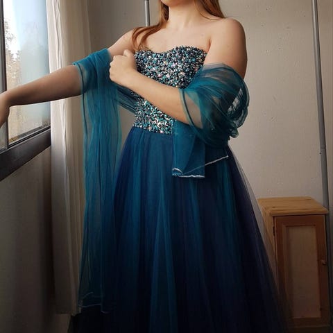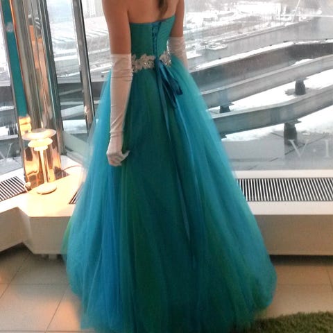 Kerran käytetty upea Vanhojentanssimekko 🩵 virheetön kunto. Selässä nyöritys, rintaosassa kevyt toppaus. Kokolappu oli näköjään vain hintalapussa, oli mielestäni M mutta meillä tämä oli S-kokoisella käytössä, nyörityksellä saa hyvin säädettyä. Ompelijalla lyhennetty 162cm pituiselle, vannehameen kanssa sopivaksi. Ja huom, mukaan tulee vannehame ja pukupussi! Myynnissä muuallakin. Kissatalous, mutta mekko säilytetty aina vaatehuoneessa.