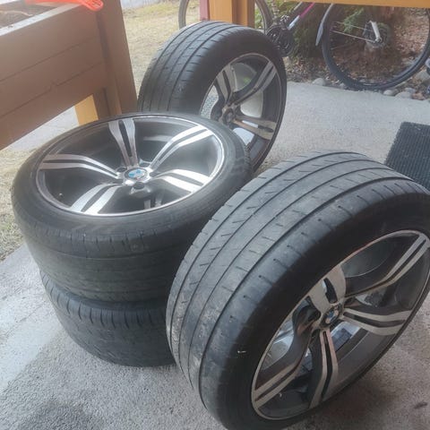 Tomason merkkiset vanteet ylimääräisenä tallista pois. Kahta vannetta jouduttu hitsaamaan ajan myötä, mutta ovat suorat eivätkä täristä. Yhden varakuminkin saa mukaan halutessaan.